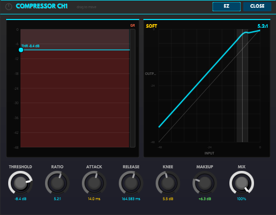 Knee: 0–12 dB soft knee width